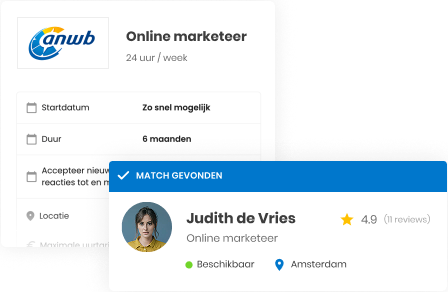 Simply create your description with our AI assignment wizard, use our powerful search engine, and get help from one of our Jellow Recruitment Consultants. We will ensure that you find the best freelancer within 24 hours. With 70K active freelancers, Jellow is considered the number one freelance platform in the Netherlands.