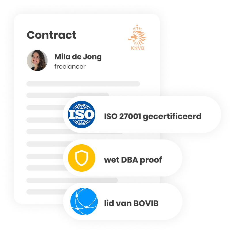 Wij zorgen er niet alleen voor het contact tussen jou en de freelancer, maar ook voor een contract dat 100% wet DBA proof is. Zo worden bijvoorbeeld gegevens zoals de KvK-inschrijving en benodigde verzekeringspolissen opgevraagd en gecontroleerd. En zijn jij en de freelancer die je inhuurt er van verzekerd, dat alles contractueel perfect in orde is.