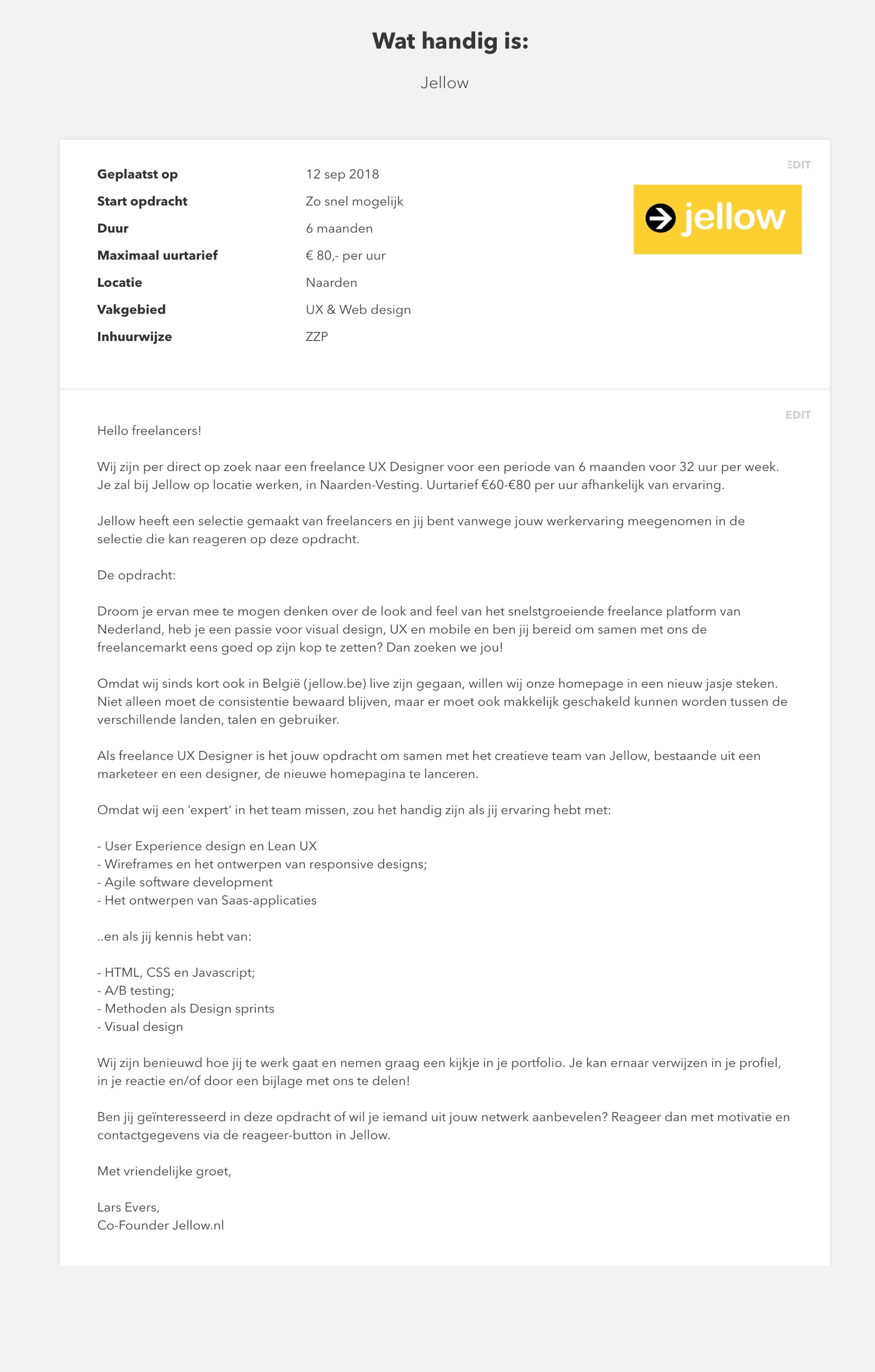 Wat zie jij nog meer graag in een reactie van een freelancer op jouw opdracht? Of als je freelancer bent, wat zou jij graag zien in de omschrijving van de opdracht? Waar word je enthousiast van? Stuur me een berichtje ([email protected]), dan kunnen we het of in een volgende blog/artikel plaatsen of toevoegen (als je dat wil ;)).