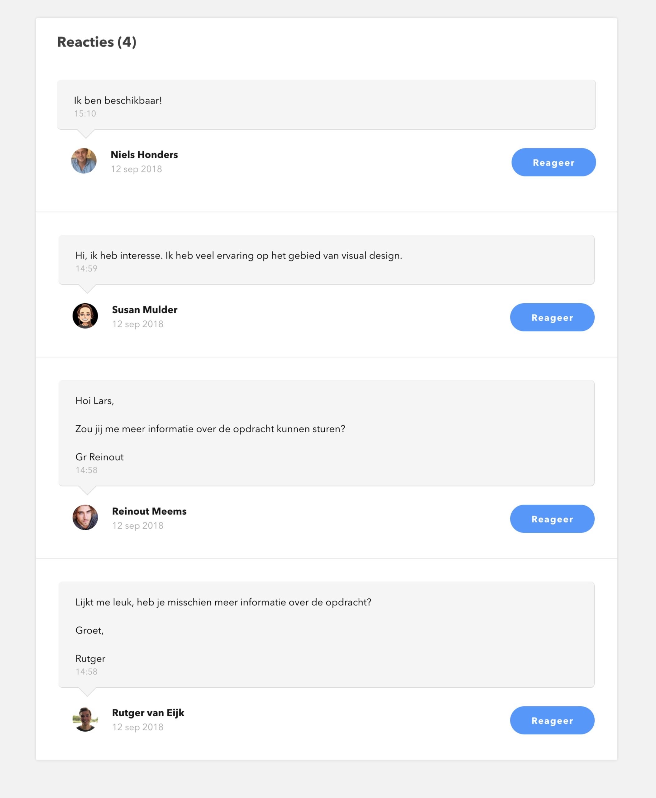 Jij zal zien dat de reacties op deze opdrachten ook heel erg zullen verschillen. Zo zullen freelancers veel minder uitgebreid reageren op de eerste opdracht. Wij hebben reacties voorbij zien komen zoals: