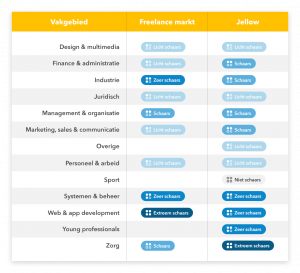 Als we de data induiken zien we dat de verhoudingen op de freelance markt veel verschillen van de vaste markt. Zo laat onderstaande Tabel 1 zien dat bijvoorbeeld professionals binnen Marketing, Sales & Communicatie ‘licht schaars’ zijn en dat het daardoor eenvoudiger is om de opdracht met een freelancer in te vullen, dan met een vaste werknemer (zeer schaars). Hetzelfde geldt binnen de IT- sector (Systemen en Beheer), Zorg en Design.